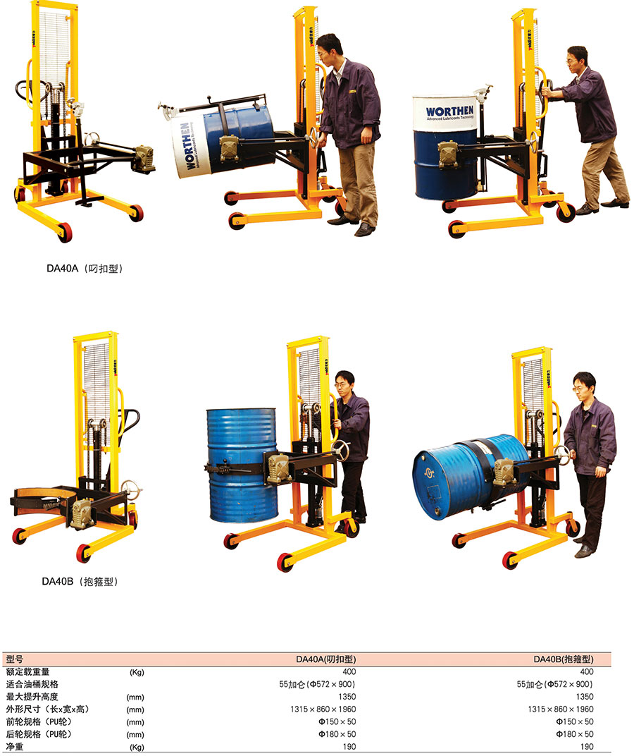 ● DA40A適用于鋼制油桶的搬運,DA40B適用于鋼制油桶或塑料油桶的搬運。